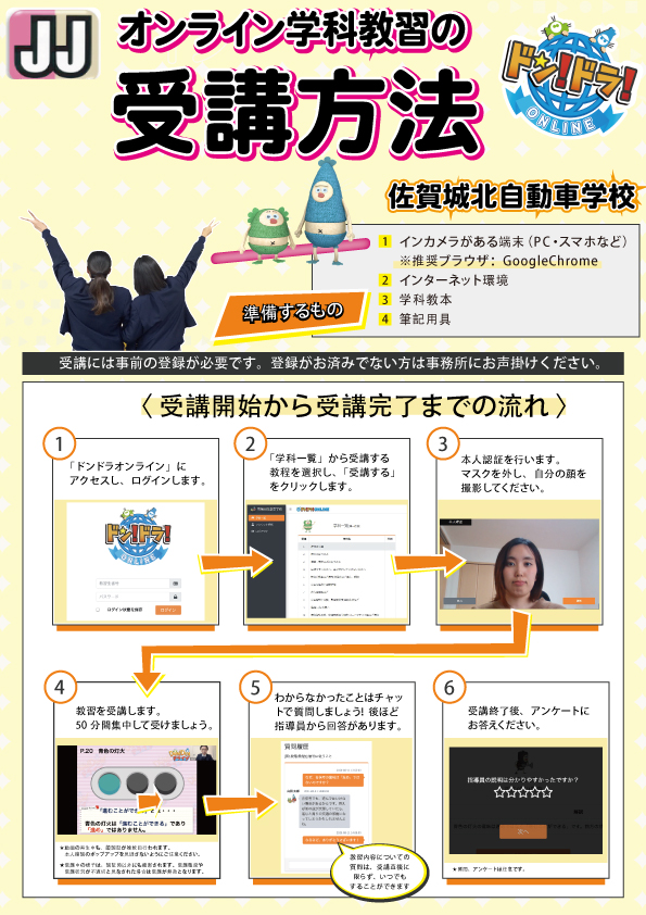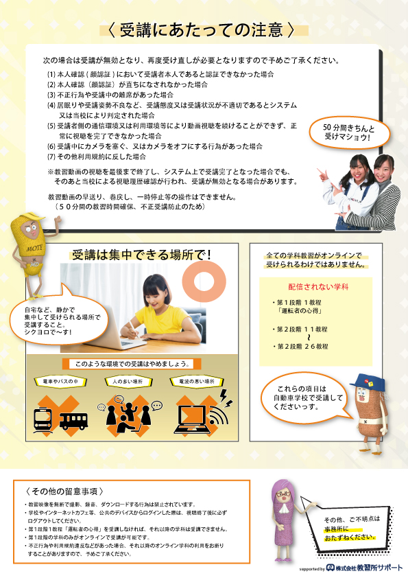 - 教習画像を無断で撮影、録音、ダウンロードする行為は禁止されてます